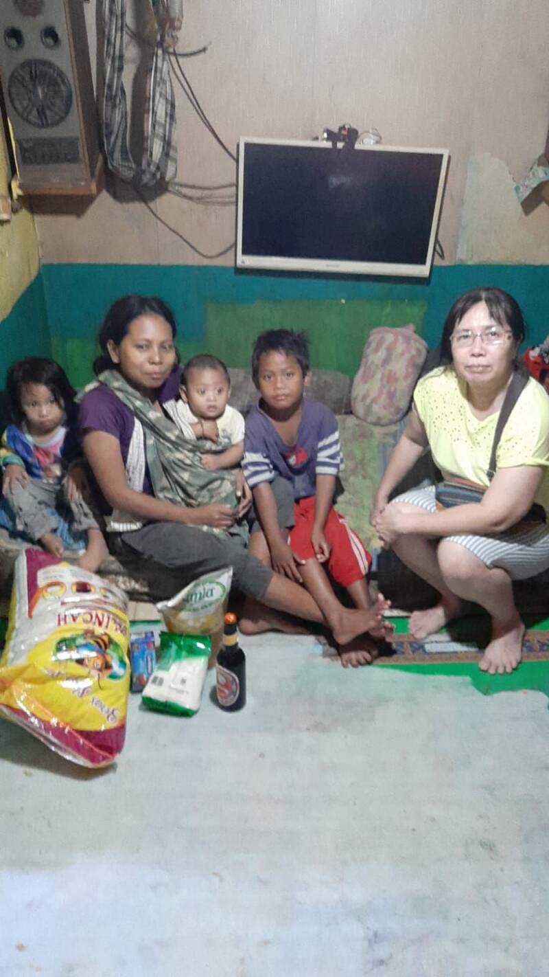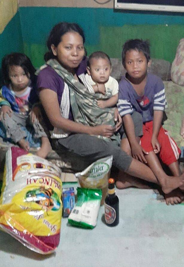 Emy heeft drie kinderen. Ze woont samen met haar man in het huisje van haar broer. Het is een zeer klein en armoedig huisje. We hebben ze voorzien van rijst, olie, suiker, kecap, thee, enzovoort.