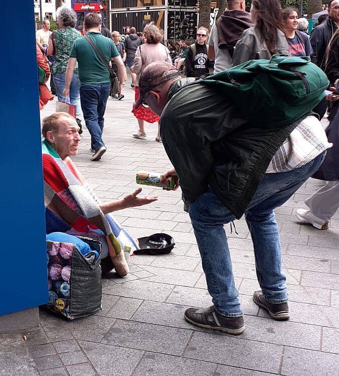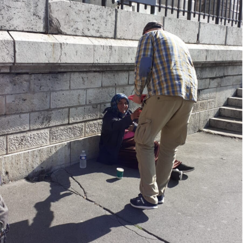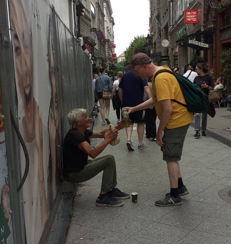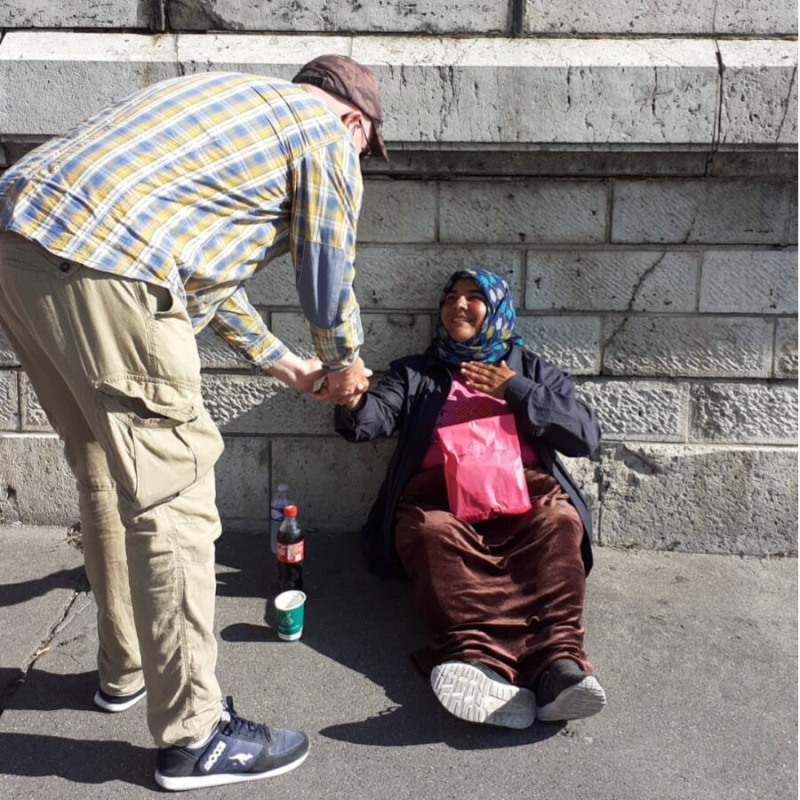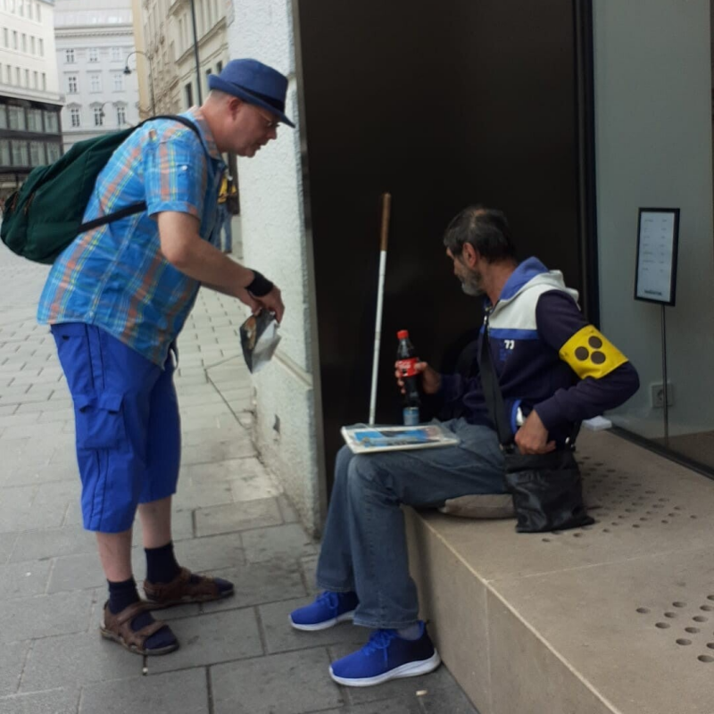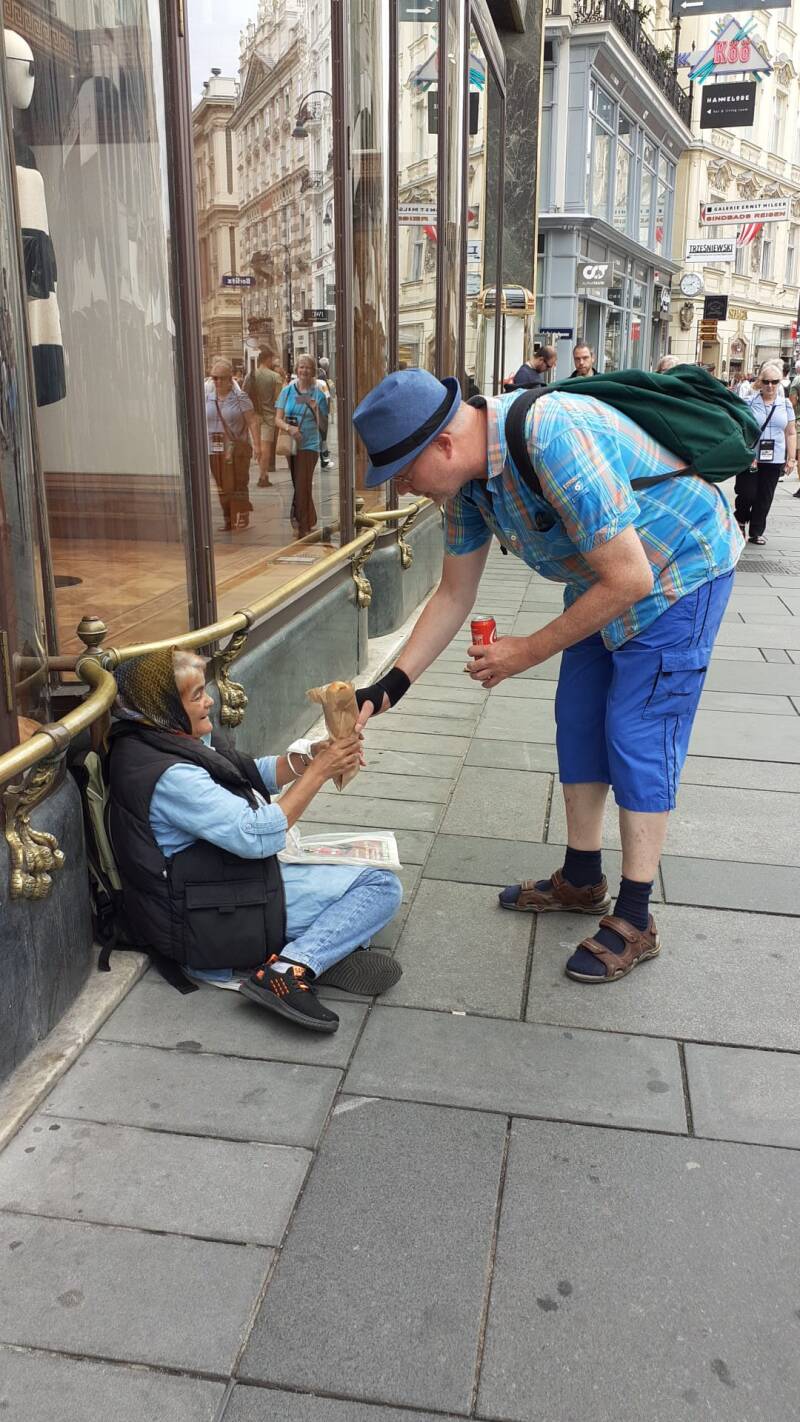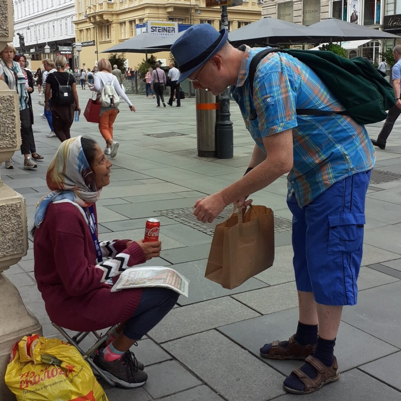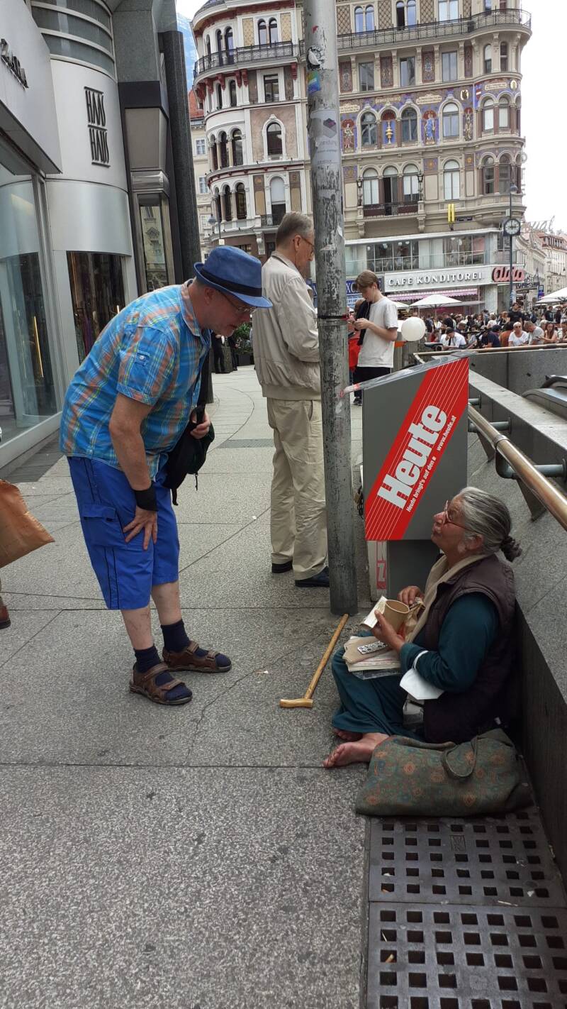 Verschillende Roma verkochten straatkrantjes of bedelden, 9 september 2022. In Wenen troffen we meerdere Roma aan: hoogbejaarden en gehandicapten, die aan het bedelen waren of een straatkrantje probeerden te verkopen. We gaven hen een broodje en wat te drinken.