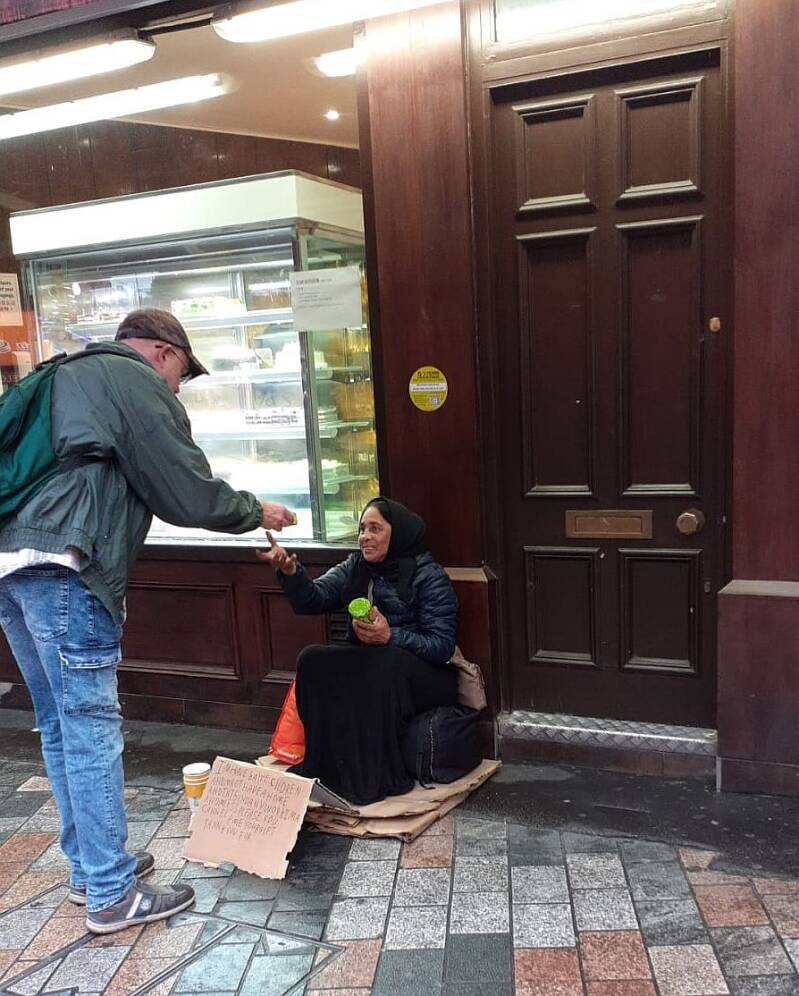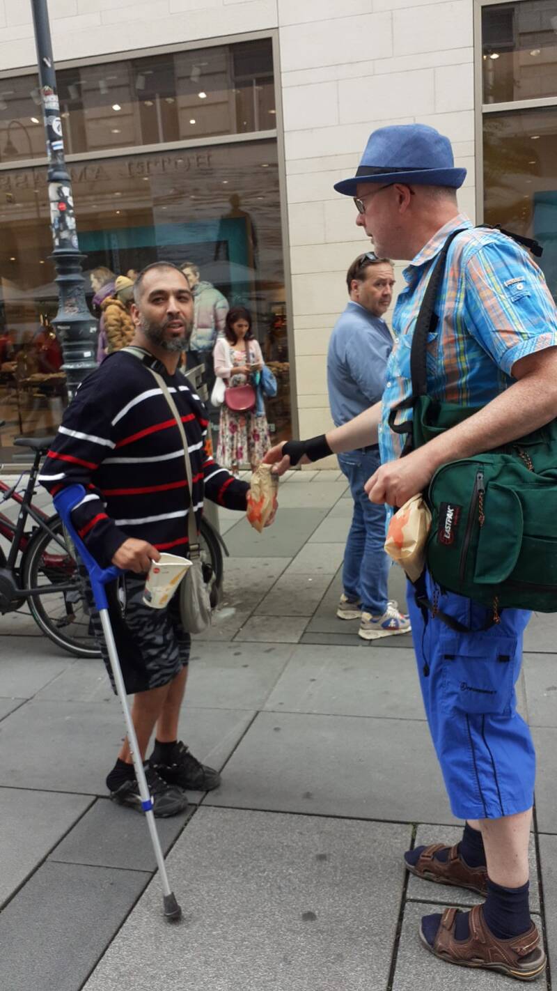 Deze meneer zei in slecht Engels dat hij tien jaar dakloos was. Hij had z'n hond al vier jaar. We vroegen hem of hij honger had en hij wilde graag wat eten. We kochten een paar broodjes voor hem.