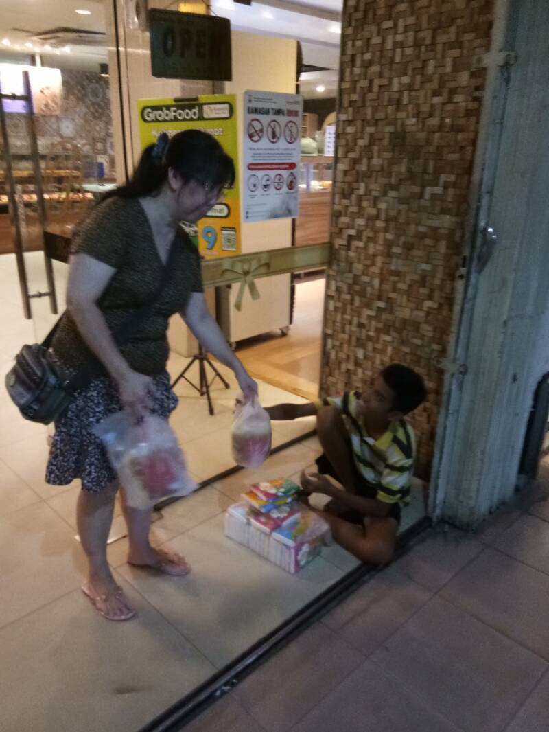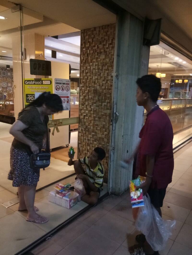 Twee jongens van ongeveer dertien jaar verkochten tissues om wat inkomen te genereren. We gaven hun gevulde broodjes met een flesje water (en een knuffeldier).