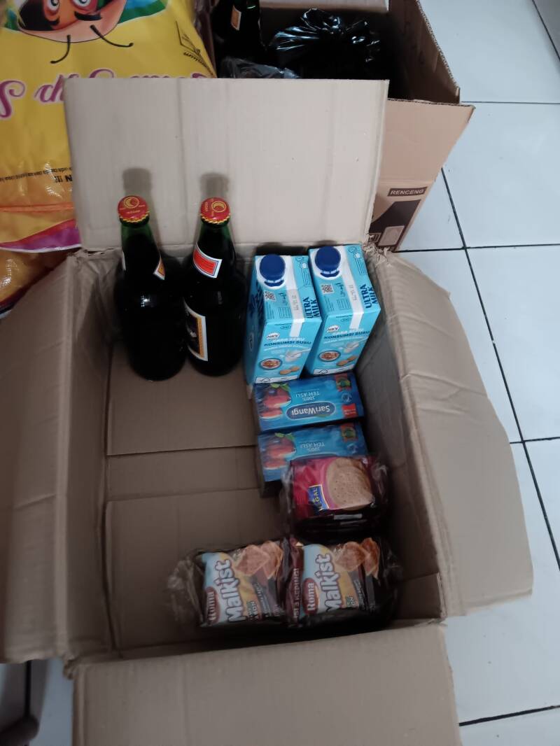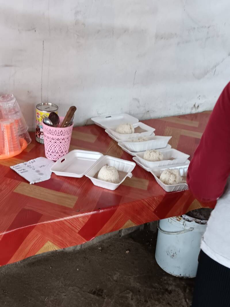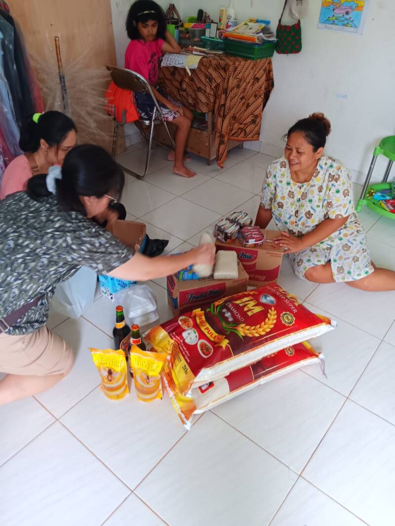 Voedselvoorraad en drie maaltijden rijst met kip voor Yanti en haar kinderen
