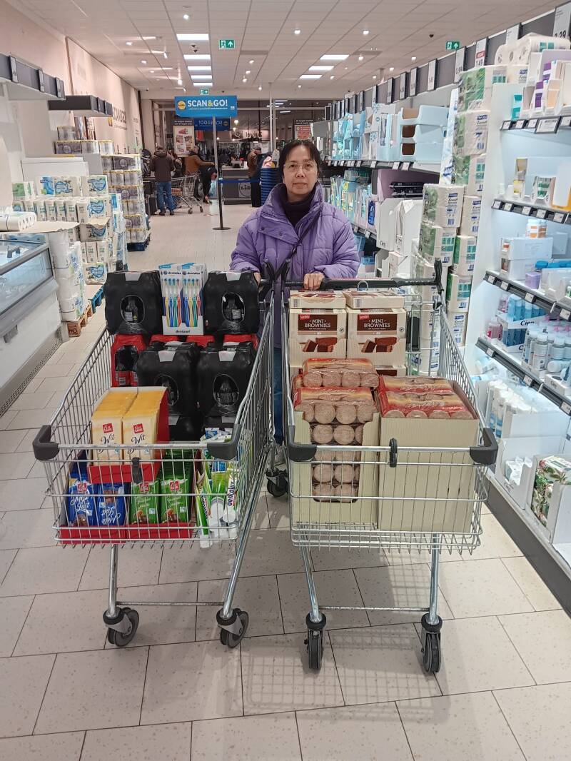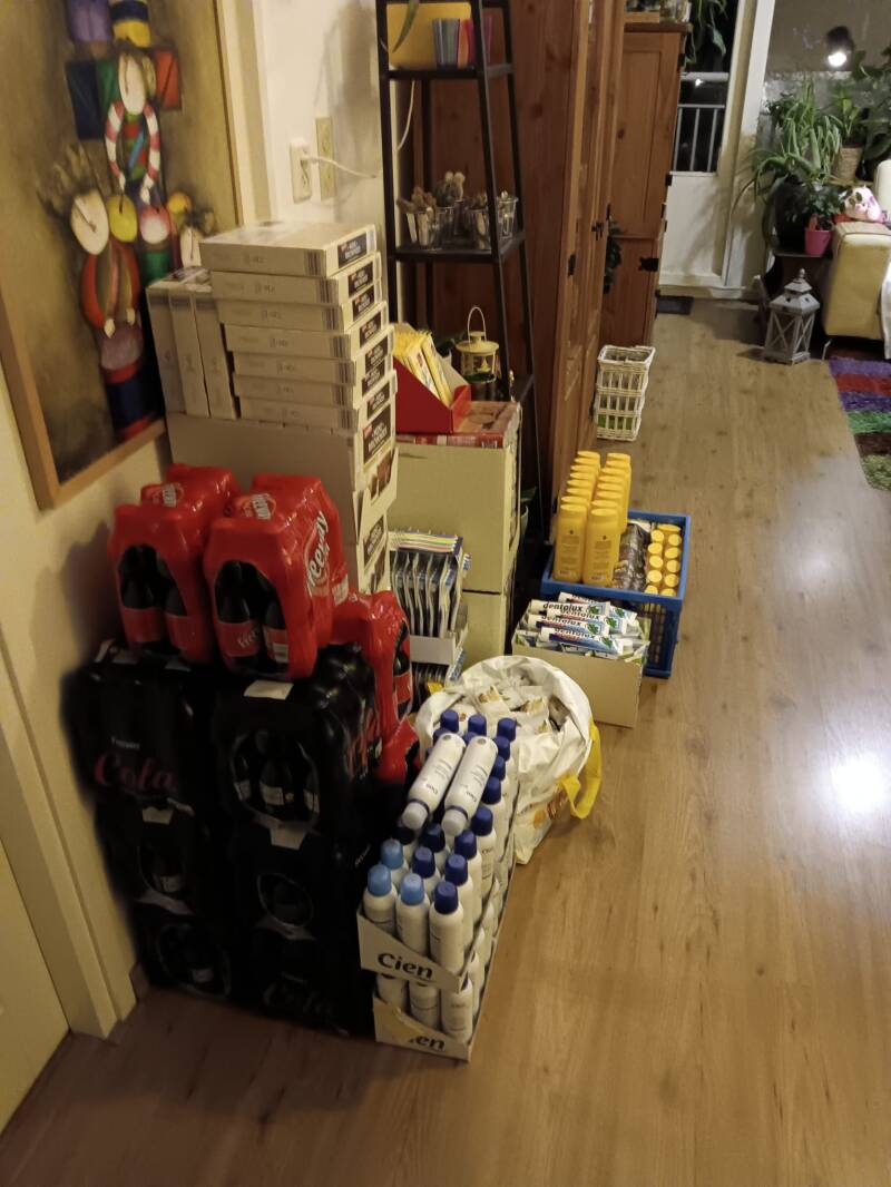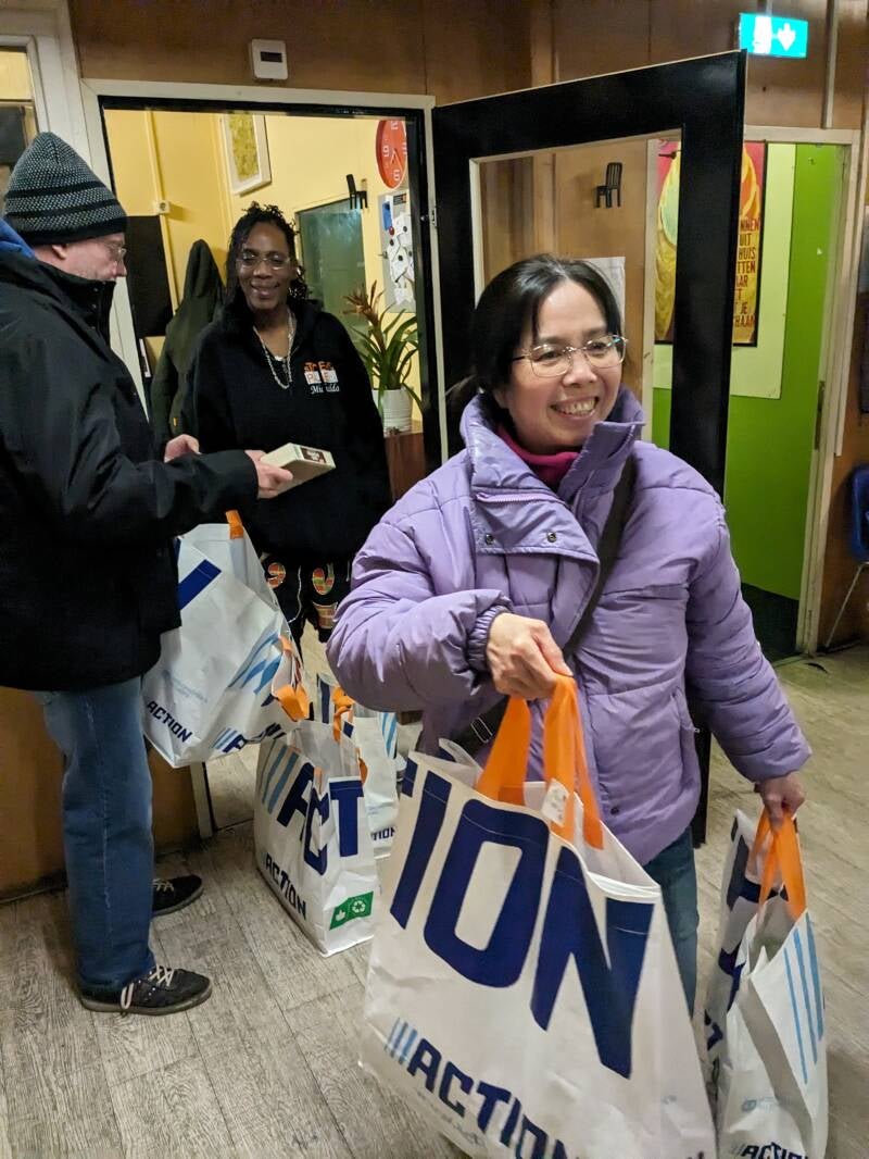We gingen daarop aan de slag om een pakketje samen te stellen voor vijftig daklozen, die ze elke nacht opvangen vanaf half september tot en met eind april. We kochten vijftig Actiontassen, die werden gevuld met shampoo. zeep, tandpasta, tandenborstels, lippenbalsem, deodorant, flesjes cola, brownies, chocoladerepen en een rol biscuits. Ook voegden we een kaart toe met de bijbeltekst 'Dank God, onze Vader, altijd voor alles in de naam van onze Here Jezus Christus.' (Efeziërs 5:20)