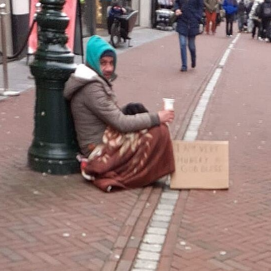 Een Roma bedelt om geld in het centrum van Leiden. Op het kartonnen bord staat: I am very hungry. Hij kreeg een broodje en flesje cola.