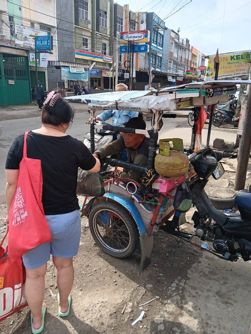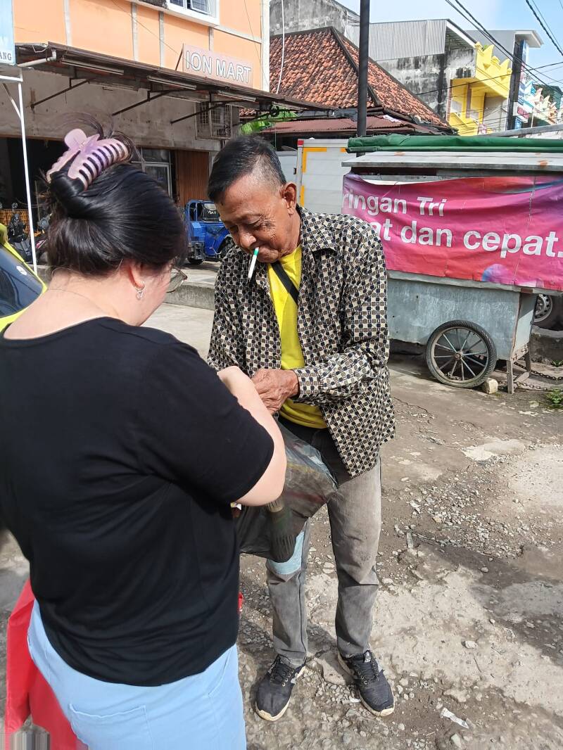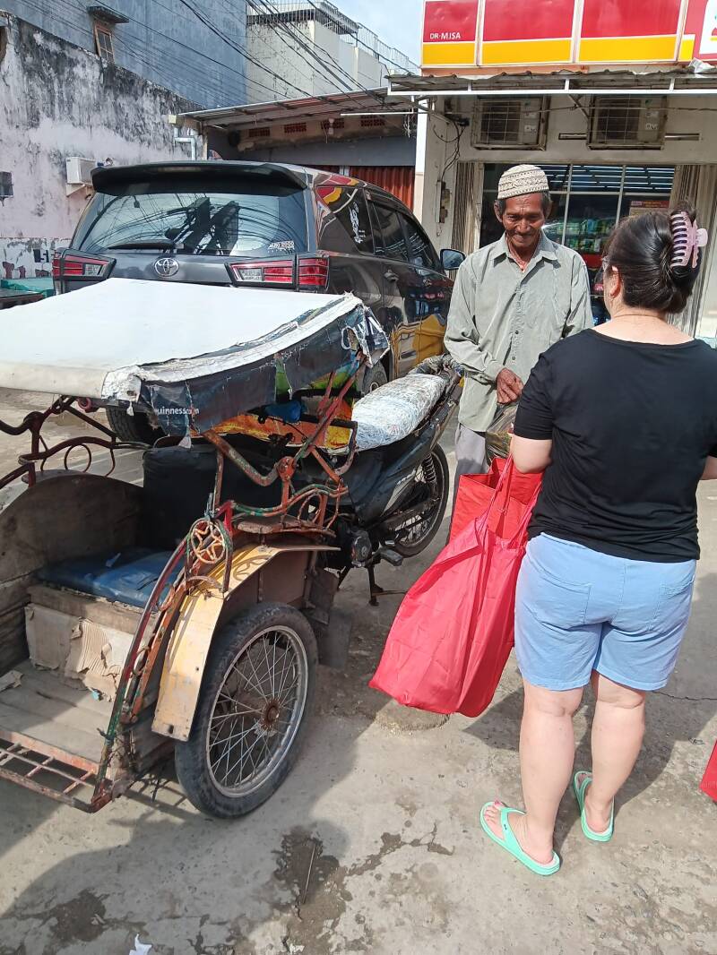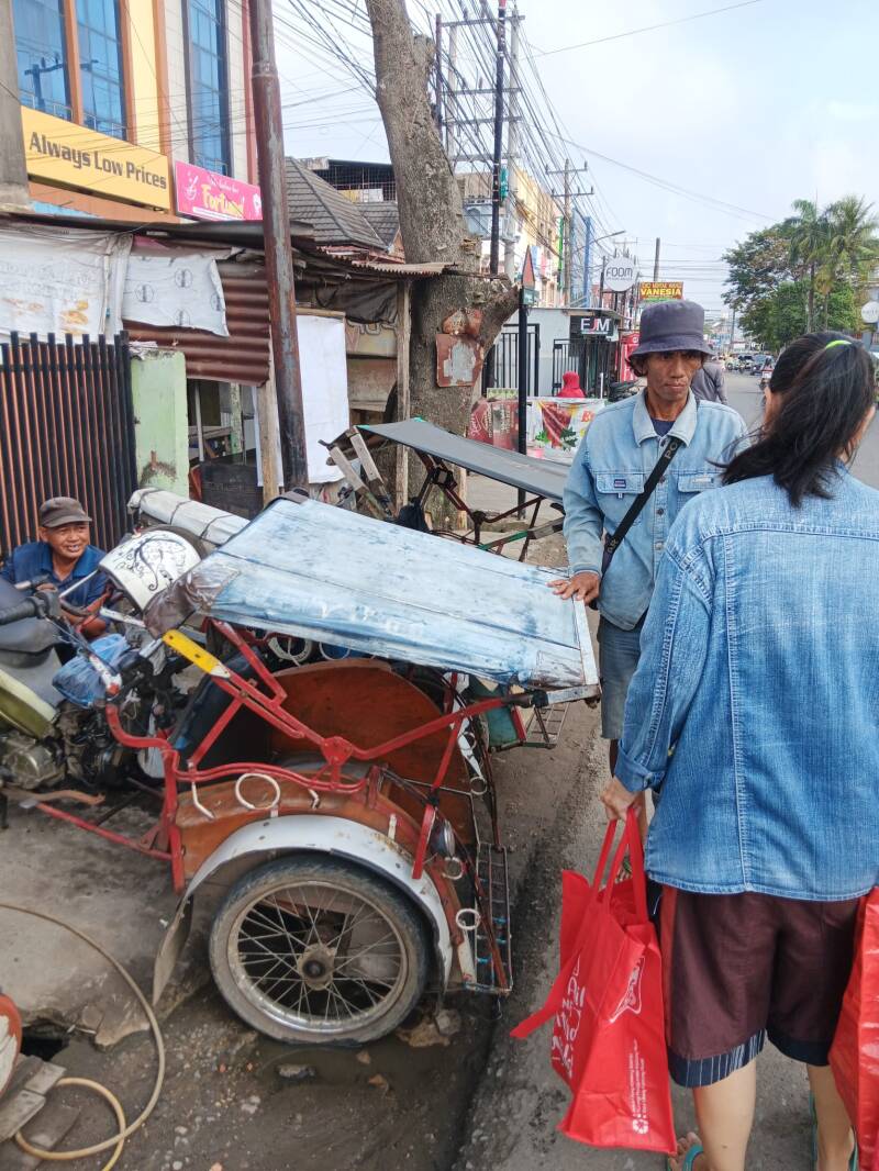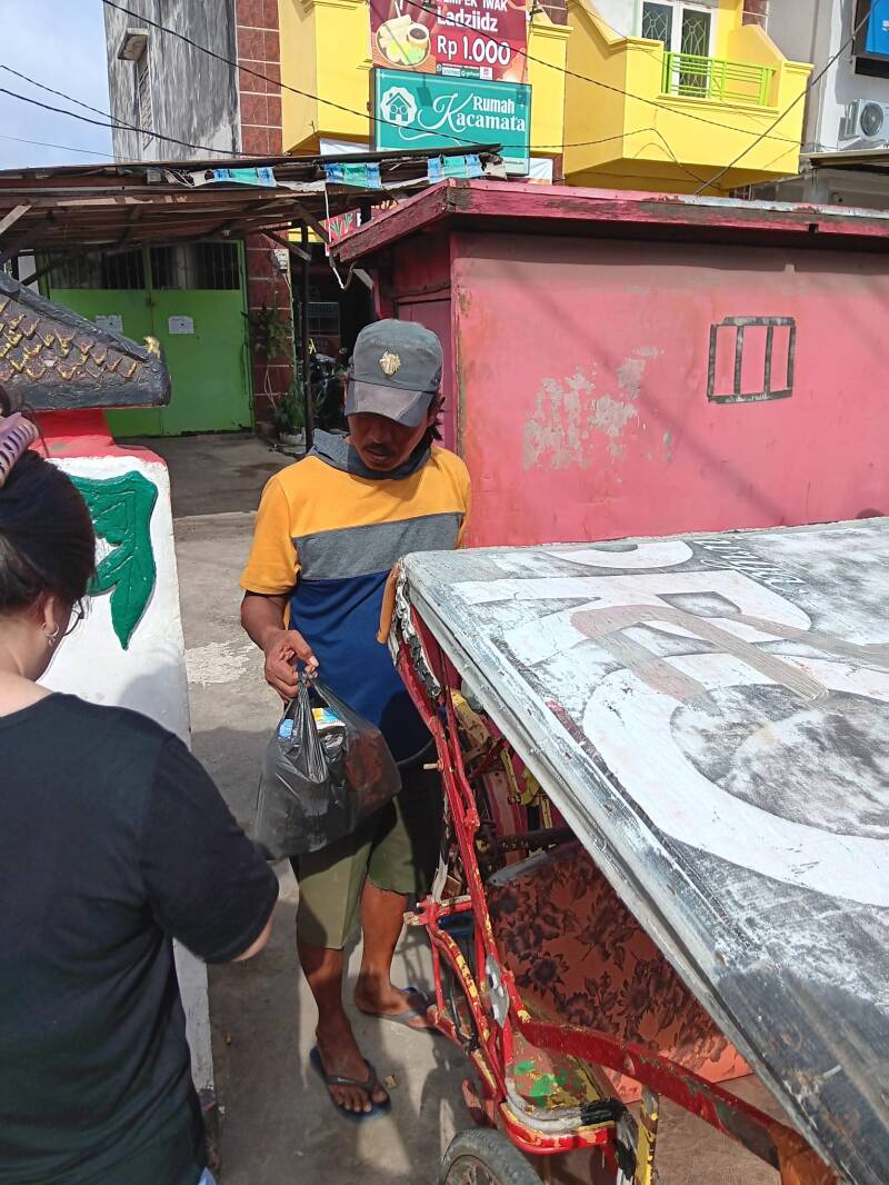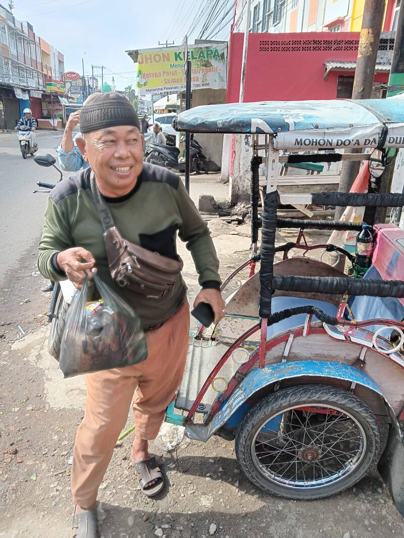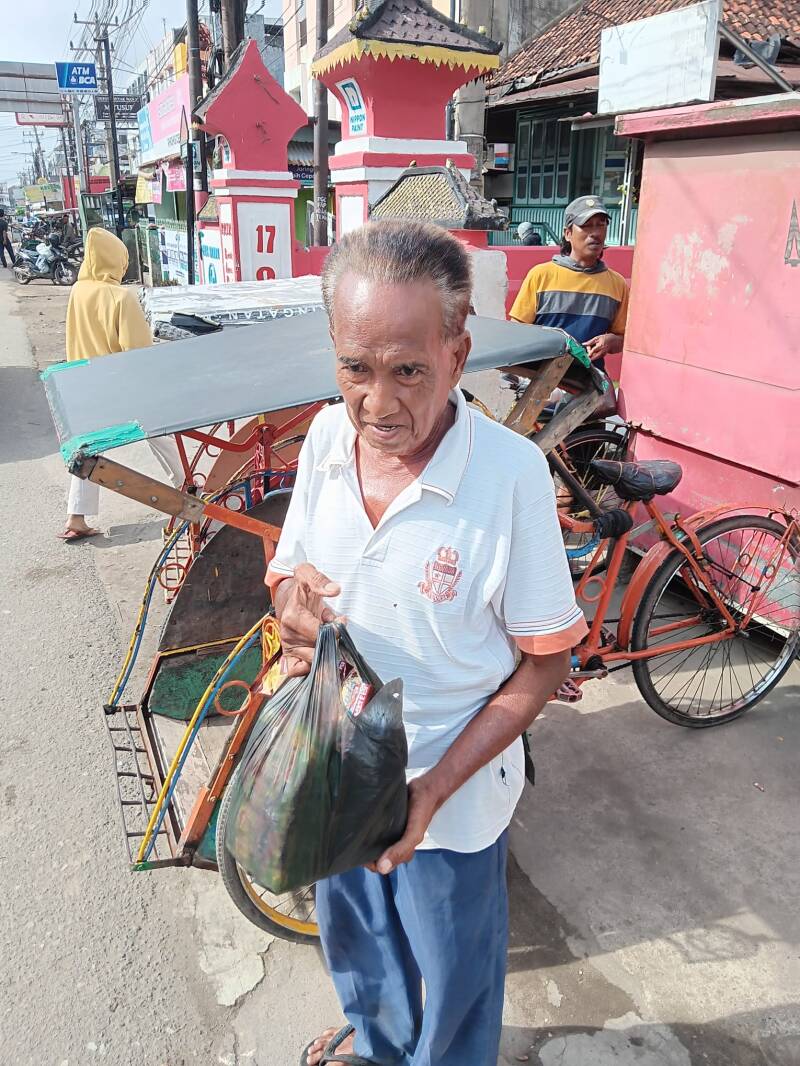 Wij hebben verschillende becakrijders een tasje gegeven met flesjes drinken, brood, vijf pakjes noedels en snacks. Ze waren er duidelijk blij mee.