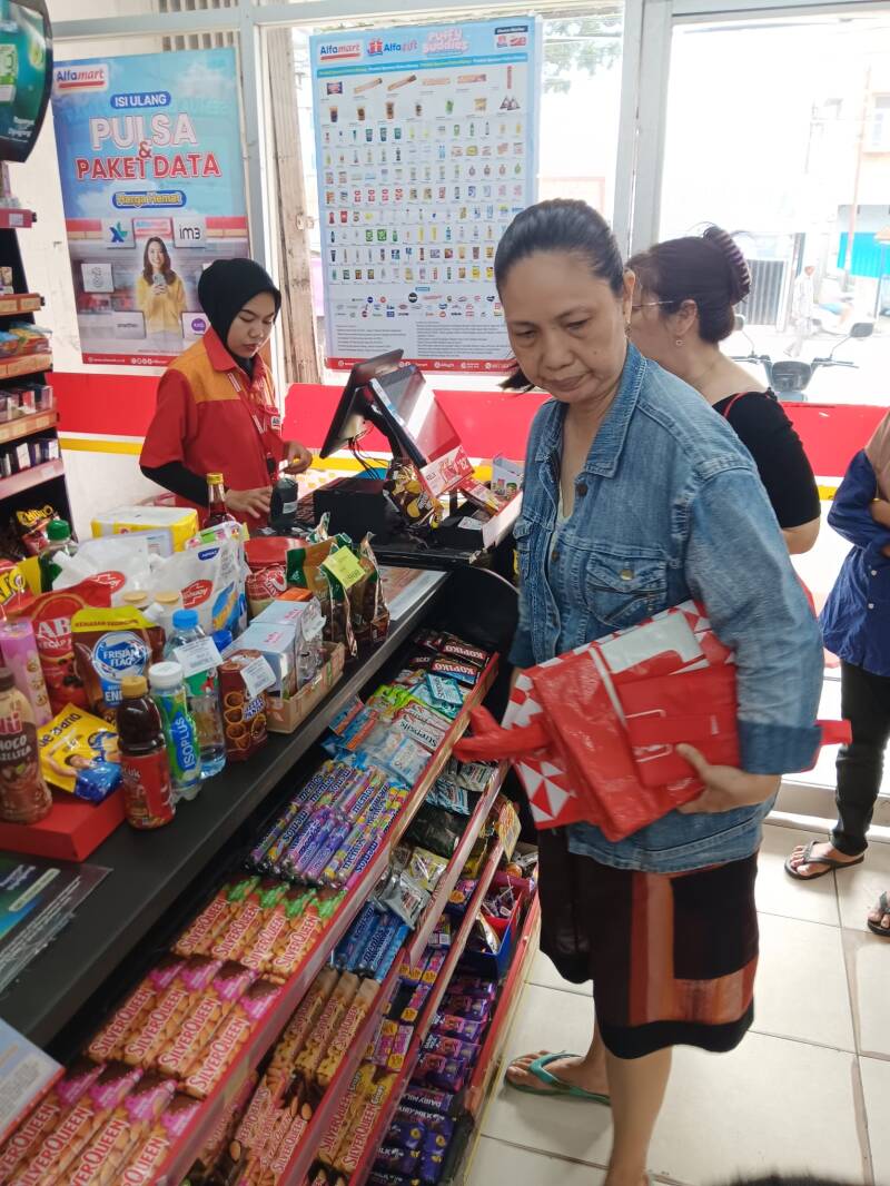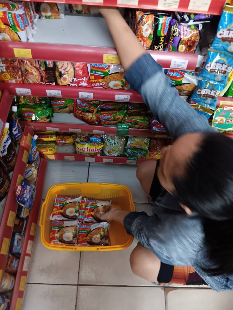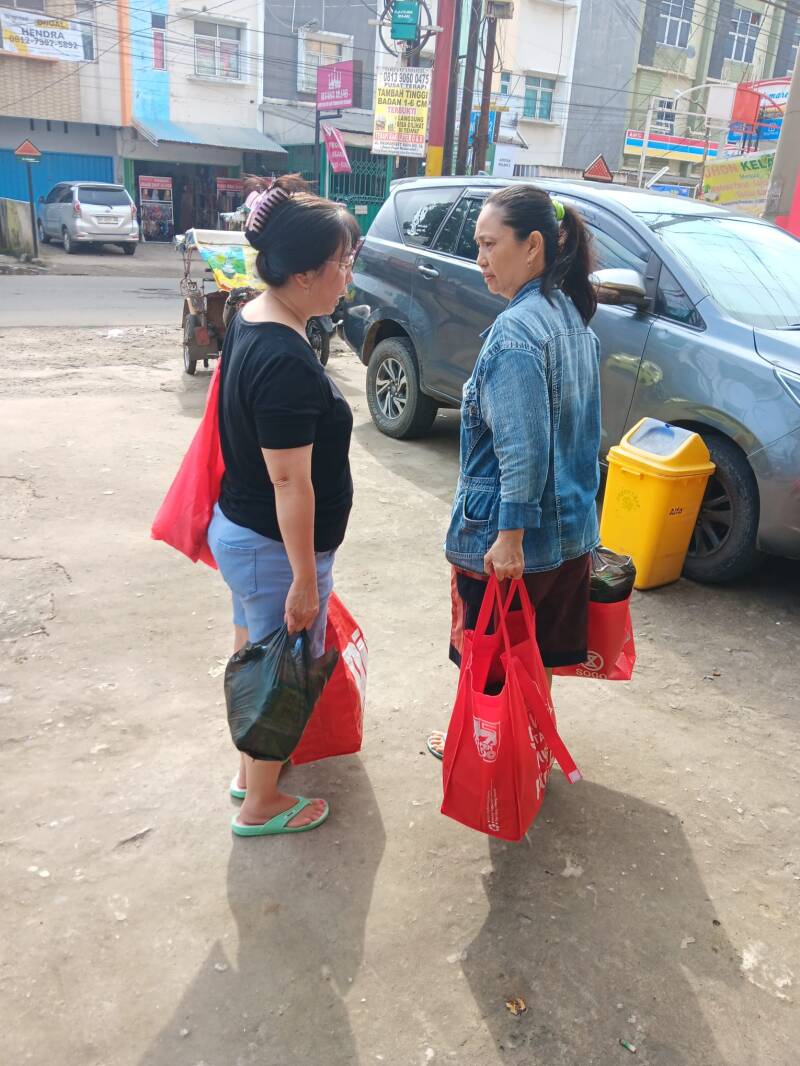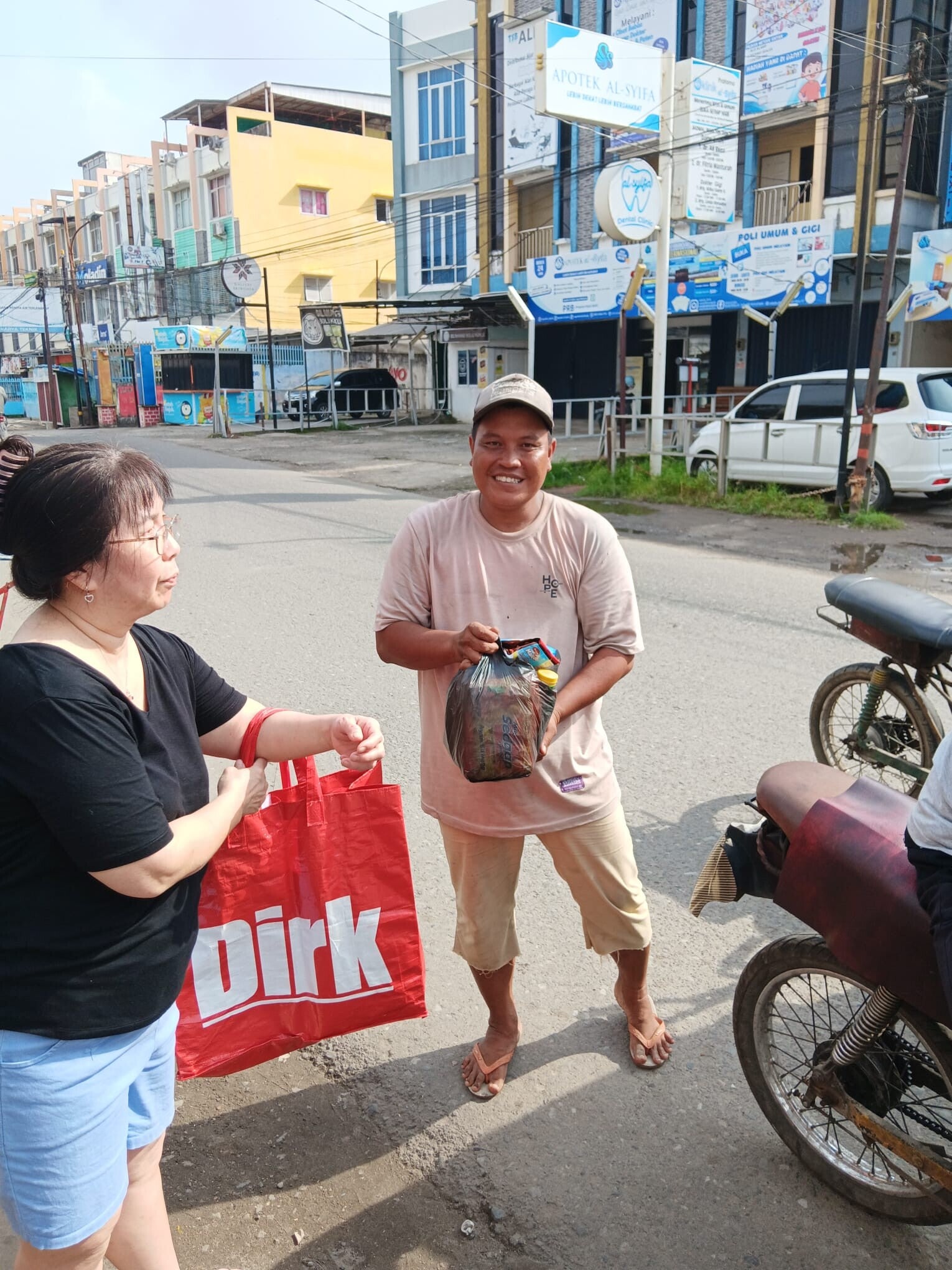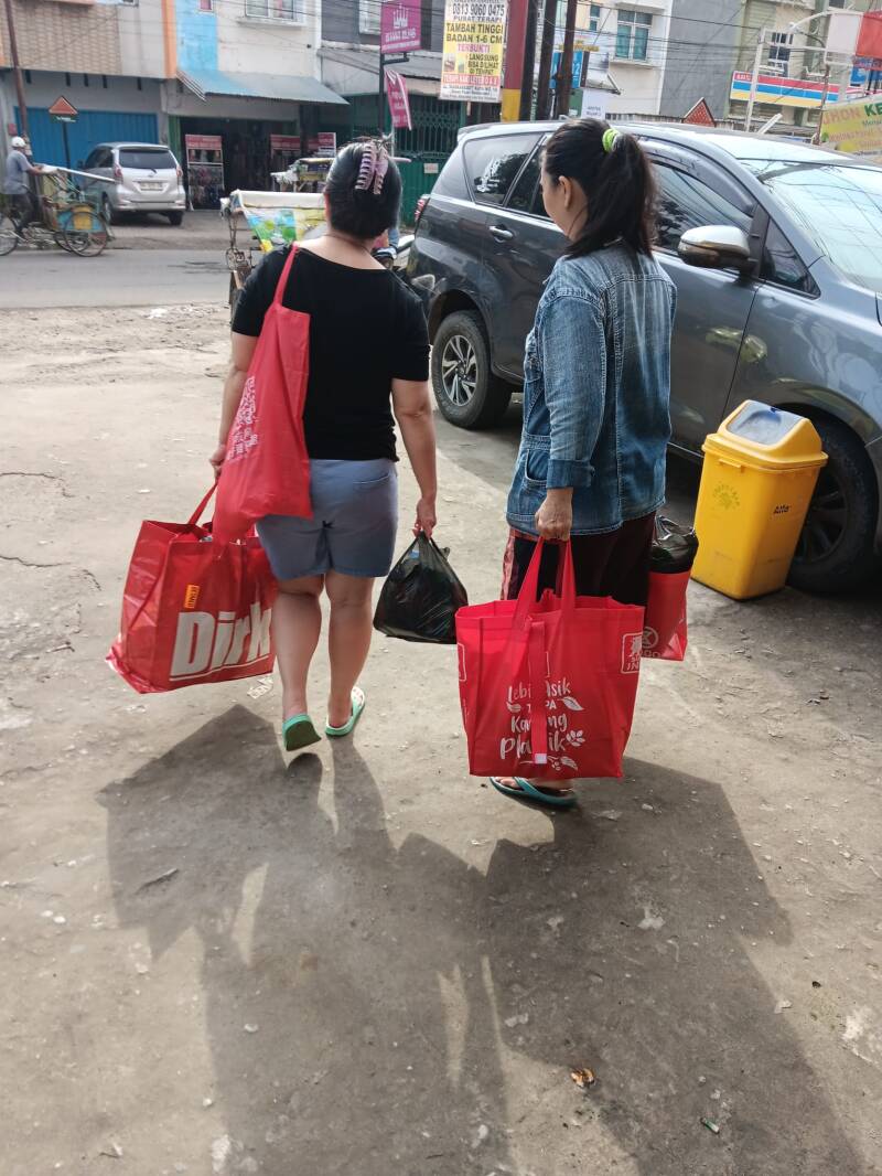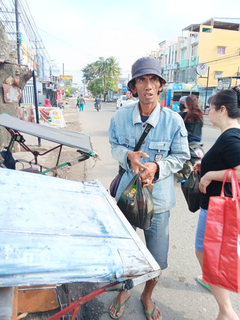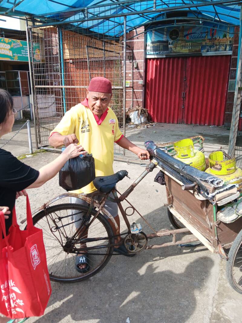 Wij hebben verschillende becakrijders een tasje gegeven met flesjes drinken, brood, vijf pakjes noedels en snacks. Ze waren er duidelijk blij mee.